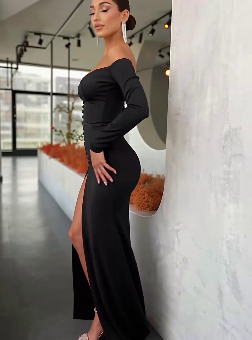 This elegant off-the-shoulder evening dress features a flattering sweetheart neckline and a mermaid silhouette that accentuates your curves. Long sleeves add sophistication, while the front split offers a subtle yet alluring touch, allowing ease of movement. Perfect for formal occasions, this dress combines classic design with modern details to ensure you stand out with grace and confidence.