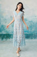 Blue V-neck Short Sleeves A-line Dresses with Sash feature a flattering V-neckline and a classic A-line silhouette that complements every figure. The matching sash accentuates the waist, creating a chic and elegant look for any occasion.