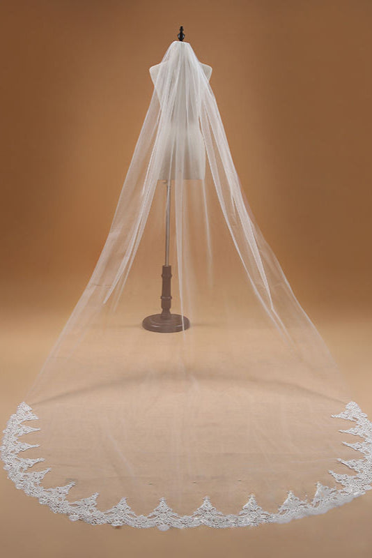 This elegant one-tier wedding veil features a delicate lace edge that adds a subtle touch of sophistication. Crafted from soft tulle, it offers a lightweight and airy feel, gracefully extending to a long length that complements a variety of bridal gowns. Designed for effortless wear, this veil enhances your bridal look with timeless charm and refined simplicity.
