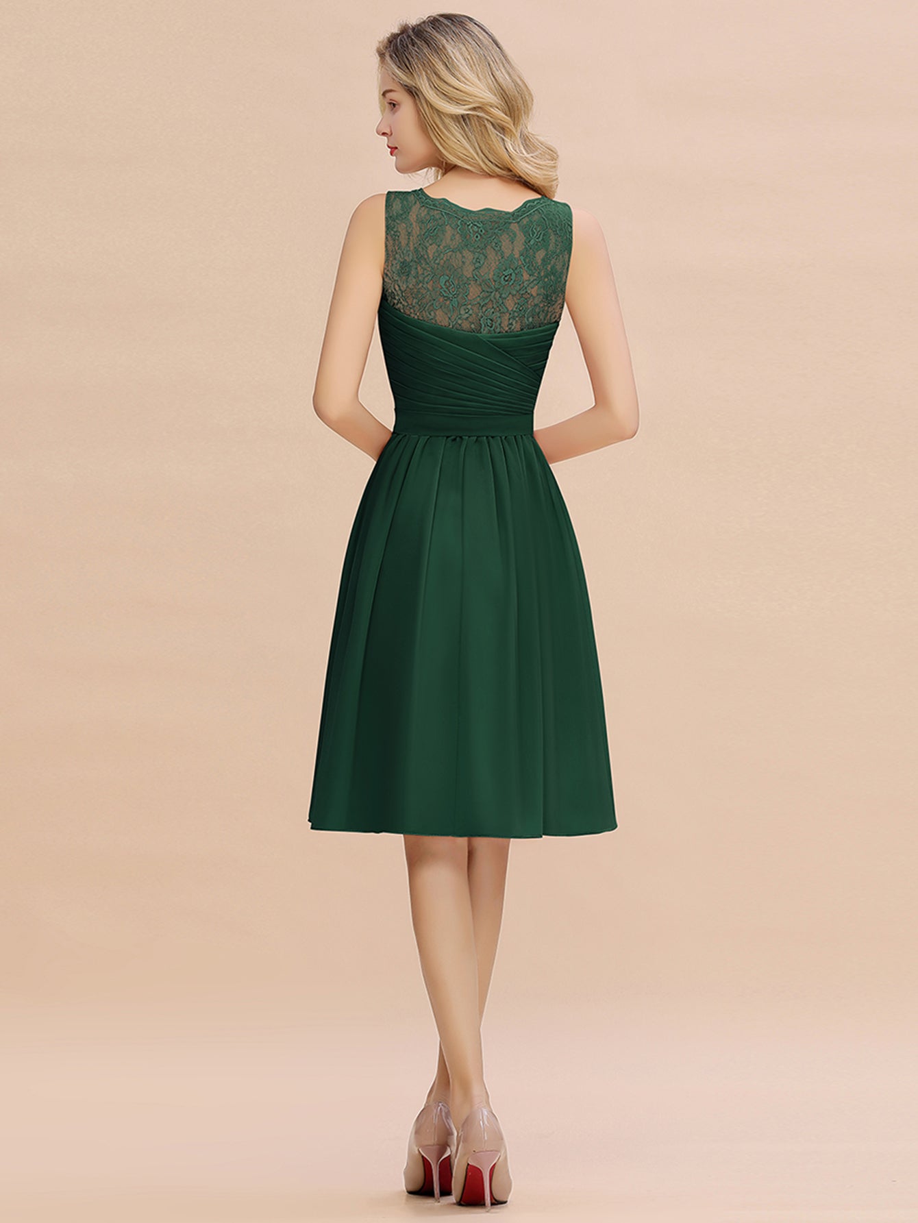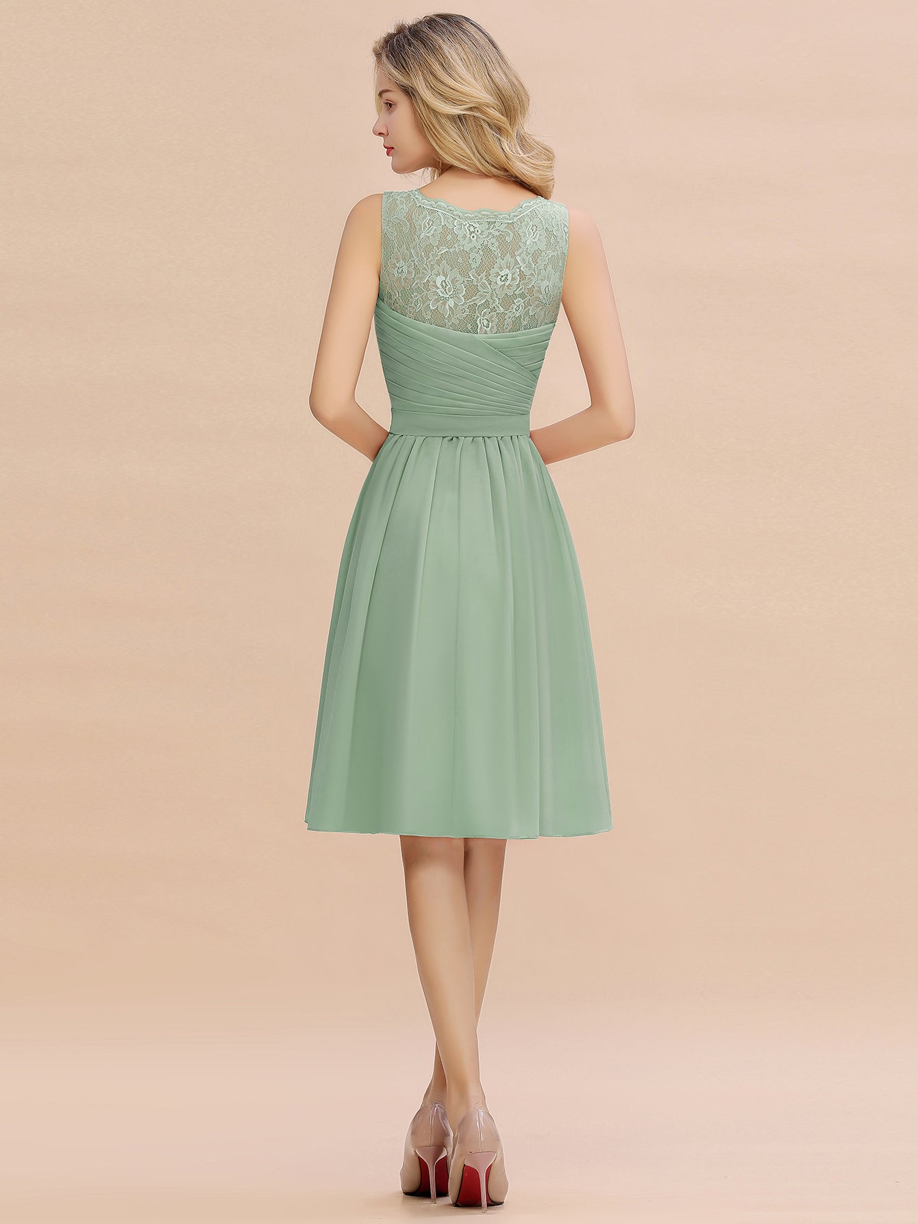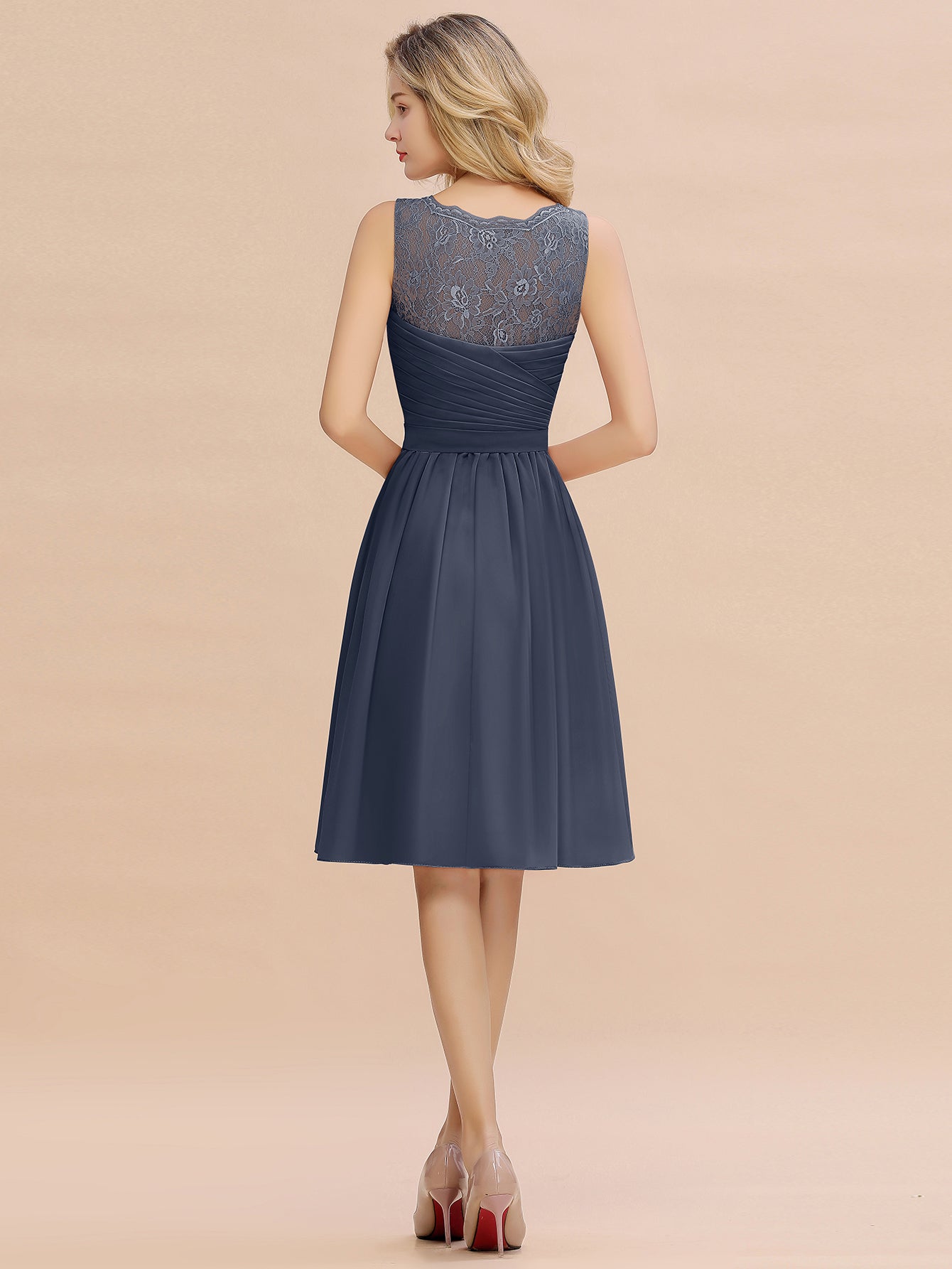 This elegant bridesmaid dress features a flattering A-line silhouette with a V-neck design, crafted from lightweight chiffon for comfortable wear. Its knee-length cut offers a modern yet timeless look, perfect for complementing any wedding style with understated sophistication.