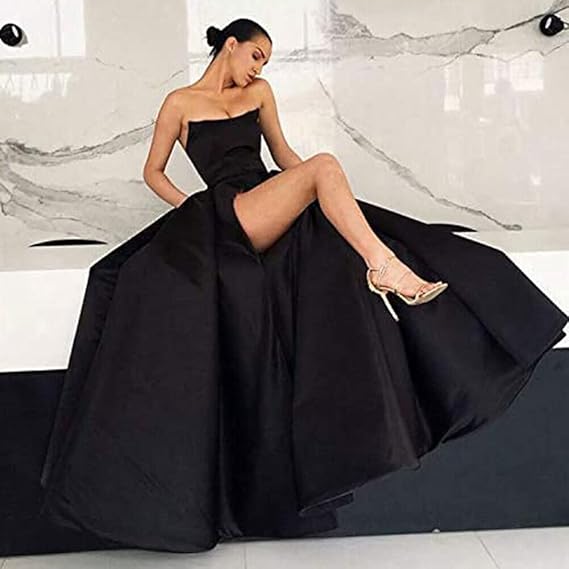 Strapless Long A-line Split Front Satin Black Wedding Dress with Pockets